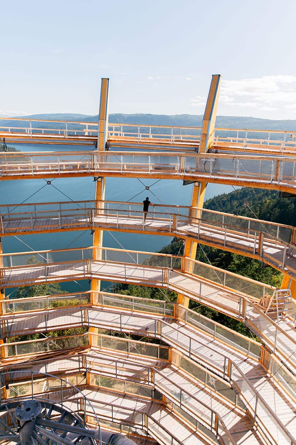 The Malahat SkyWalk sits 250 metres above sea level and delivers a full 360-degree panorama — Mt. Baker, Finlayson Arm, the Saanich Peninsula, and the islands stretching out in every direction. Elevated walkways wind through stands of fragrant arbutus and towering Douglas fir, and the whole experience feels genuinely immersed in the coastal forest. Charlie made it to the top with a grin. Bucket list: checked.